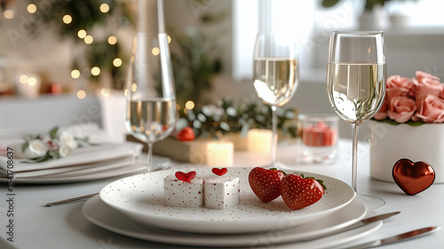 Romantic dinner setting featuring elegant tableware, sparkling wine glasses, and decorative elements. table is adorned with strawberries