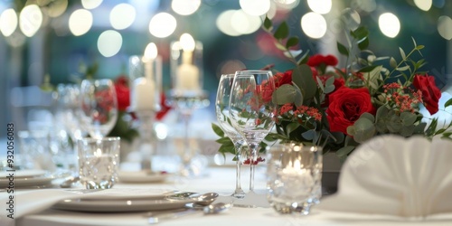 table, dinner, setting, rose, red, candle, glassware, romantic, elegant, white, tablecloth, flower, centrepiece, wedding, celebration, special, occasion, dining, eatery, love, luxury, floral, arrangement, decor, ambience, atmosphere, candlelight, intimate, posh, beautiful, delicate, soft, warm, glowing, sparkling, still life, closeup, sharpened, photo, image, interior, event, design