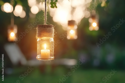 Romantic garden evening candles in jars hang from tree branches, illuminating a relaxing outdoor scene with blurred background of lounge chair and sunset, perfect for wedding or event invitations