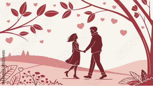 Romantic Happy Valentine’s Day Illustration With Couple Smiling, Hearts, And Decorative Leaves For Love And Holiday Design