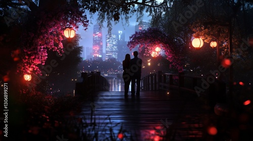 couple, bridge, night, city, silhouette, romantic, love, dark, light, lantern, water, lake, tree, park, flower, blossom, pink, red, urban, landscape, scenic, beautiful, peaceful, serene, calm, tranquil, evening, twilight, mood, atmosphere, date, together, intimate, mystical, magical, dreamy, artistic, digital, art, illustration, photo