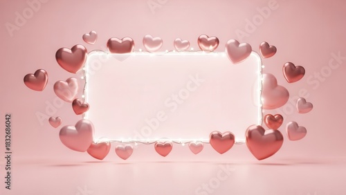 Romantic Pink Hearts Frame with Glowing White Rectangle on a Soft Background.