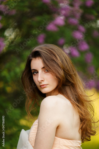 Romantic portrait of young beautiful girl standing in spring lilac garden