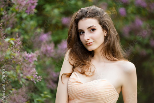 Romantic portrait of young beautiful girl standing in spring lilac garden