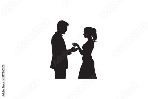 proposal, engagement, marriage, love, romance, couple, man, woman, ring, dress, silhouette, black-and-white, vector, illustration, graphic, design, wedding, bride, groom, celebration, human relationships, commitment, forever, happy, joy, together, future, promise, romantic, elegance, style, fashion, formal, event, ceremony, isolated, white background, artwork, artistic, simple, minimalist, icon, symbol, cut-out, offering