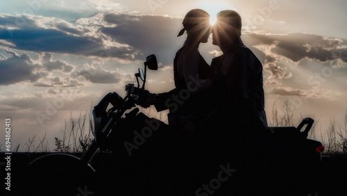 romantic silhouette couple man and woman on a motorcycle on the background of the sun and sunset sky