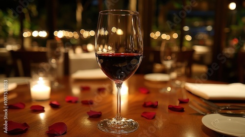Romantic table setting featuring a glass of red wine glowing candle in the background romantic and intimate