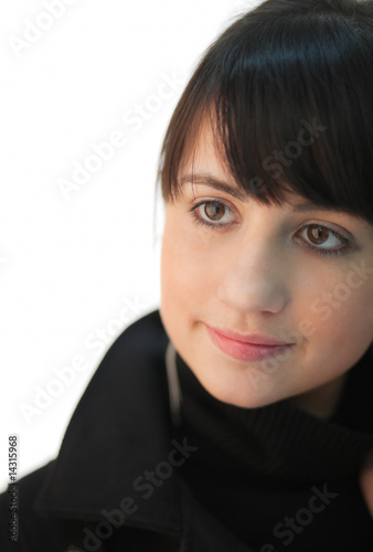 girl, young, woman, romantic, portrait, isolated, cut-out, copy space, pretty, brunette, coat, thoughtful, pensive, thought, lean, head, cropped, adult, person, female, black, hair, selective, sharpened