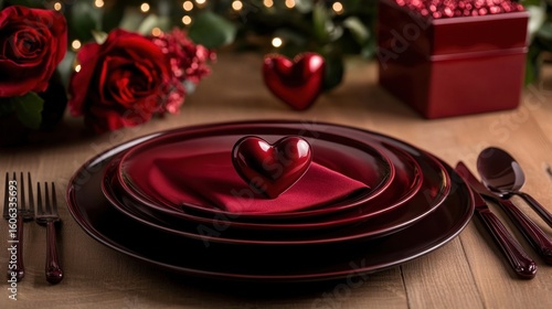 valentine, valentine, day, dinner, table, setting, romantic, red, nubes, heart, plate, silverware, cutlery, rose, flower, love, celebration, feast, elegant, luxury, ambience, passion, affection, date, couple, special