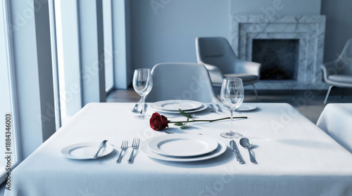 Romantic Valentine's Day Dinner Table Setting with Red Rose and Fine Dining Ambiance