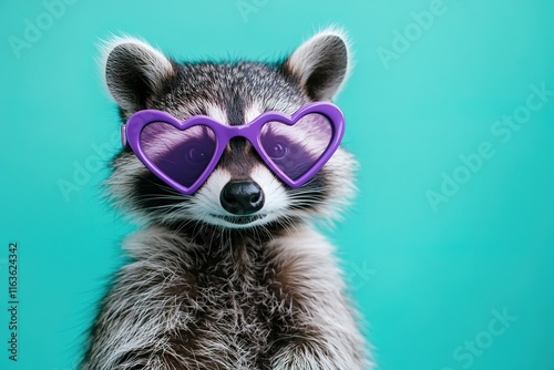 romantic valentines day postcard adorable fluffy raccoon wearing purple heart shaped glasses on blue background with copy space