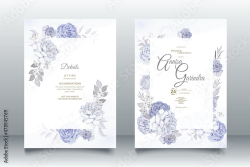 Romantic Wedding invitation card template set with blue floral leaves Premium Vector