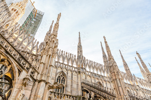 Roof of Milan Cathedral Duomo di Milano with Gothic spires and white marble statues. Top tourist attraction on piazza in Milan, Lombardia, Italy. Wide angle view of old Gothic architecture and art.