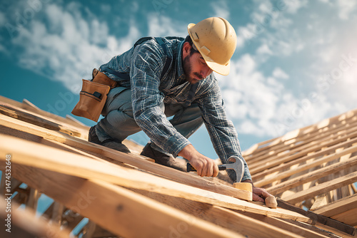 construction, men at work, building, carpenter, roof, builder, house, work, wood, working, roofer, person, home, sky, industry, people, roofing, timbering, carpenter's shop, woodworker, construction worker, safety, contractor, blue, build