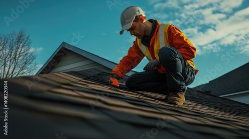 Roofing worker inspecting a roof for storm damage. Featuring careful evaluation and safety