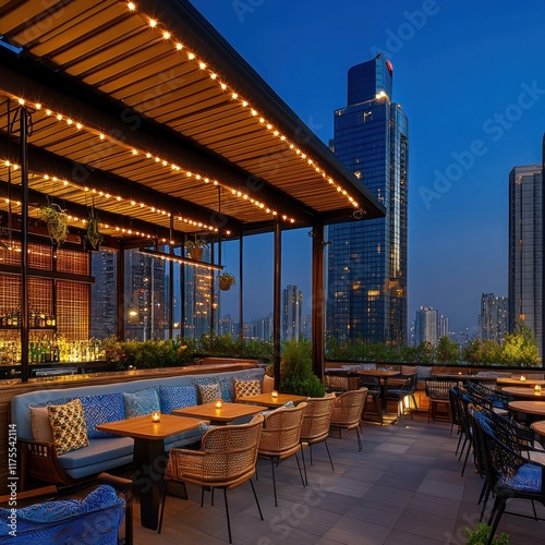 Rooftop bar at dusk, city skyline view, stylish patio furniture, string lights, plants.