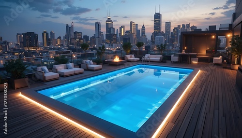 Rooftop Swimming Pool with City Skyline View at Dusk or Evening