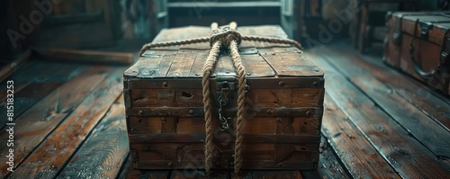 Ropes pulling a heavy idea box on a vintage wooden floor, dimly lit, low angle