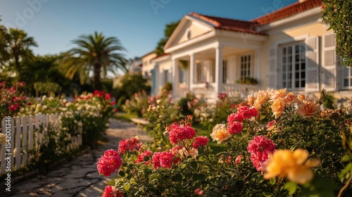 rose, rose garden, flower, garden, paseo, path, house, home, mediterranean, architecture, villa, building, landscaping, gardening, summer, sunlight, sunshine, golden hour, pink rose, red rose, blossom, bloom, flower petals, leaf, plant, greenery, white fence, picket fence, daytime, beauty, nature, calmness, peaceful, serene, idylli, vibrant
