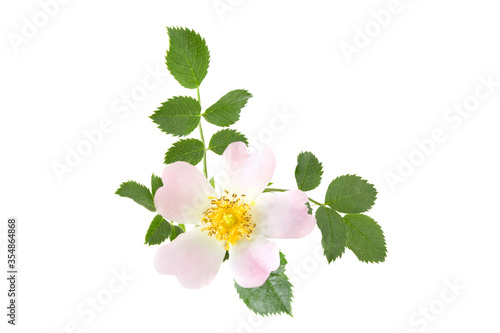 Rose hips (Rosa canina) flower and green leaves isolated on a white background.