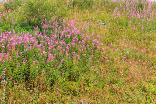 Rosebay willowherb or fireweed (Chamaenerion angustifolium) growing on the alpine meadow