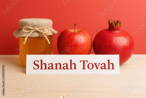 hashanah, celebration, apple, pomegranate, honey, jewish, new, year, tradition, festive, holiday, greeting, card, red, rustic, sweet, fruit, symbol, autumn, harvest, wooden, table, jar, bow, twine, seasonal, fresh, natural, culture, religious, festivity, joyful, blessing, healthy, vibrant, delicious, decorative, background, message, happy, prosperity
