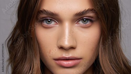 Rostro de mujer de cerca con piel perfecta y saludable y pecas naturales, ojos azules penetrantes y cabello castaño ondulado. Concepto de cosmetología, cuidado de la piel y belleza real.