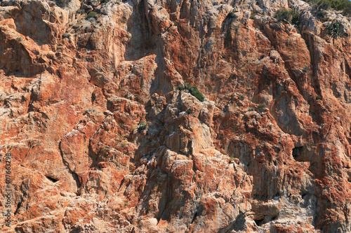 Rote Felsküste an der Ostküste Mallorcas mit leichtem Bewuchs.