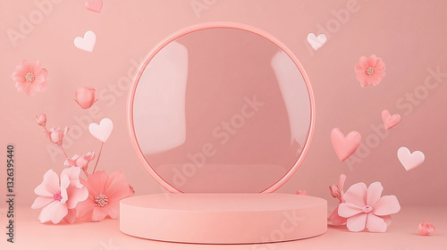 Round empty podium on a soft pastel background, surrounded by flowers,hearts. Perfect for Mother's Day, Women's day, March 8,Easter promotions. Podium for product presentation and demonstration