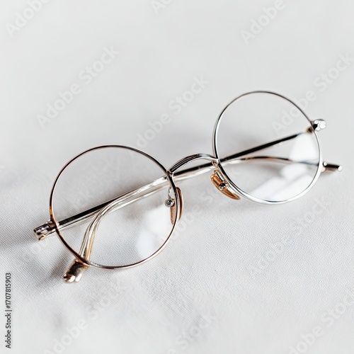 eyeglass, round, metal, clear, lense, frame, light, surface, fashion, accessory, style, modern, elegant, vintage, retro, spectacle, vision, care, detail, closeup, photo, still life, minimalism, simple, gold, silver, thin, transparent, optical, design, luxury, minimalist, high-end