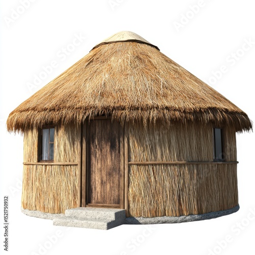 hut, thatched, round, wooden, door, window, brown, thatch, simple, design, tropical, rustic, isolated, background, white, architecture, building, shelter, home, bungalow, countryside, rural, village, traditional, culture, primitive, sustainable, environmentally friendly, digital artwork, illustration, image, photo, house, dwelling, cabin, structure, exterior, front view