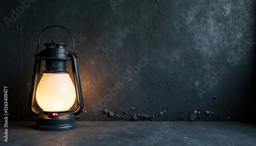 Round white lantern glowing against dark vintage concrete backdrop with copy space, vintage, dark