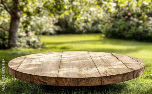 Round wooden table in a garden