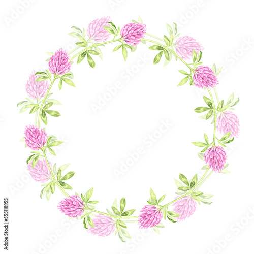 Round wreath of blooming clover. St.Patrick 's Day. Watercolor illustration. Isolated on a white background.For your design packages of seeds, goods for a garden, stickers, organic products, stickers
