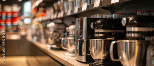 kitchen, appliance, mixer, racked, blender, food, processor, stainless, steel, bowl, machine, hot drink, modern, french, stove, cafes, maker, bean, pot, design, press, motor, store, shop, white, contraption, ware, close, mark, good