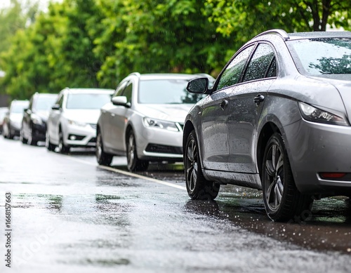 car, street, rain, parked, wet, grey, silver, line, row, asphalt, city, urban, traffic, vehicle, transportation, water, puddle, shiny, metallic, roadway
