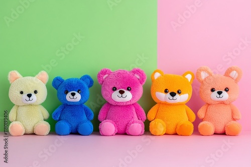 Row of colorful plush teddy bears in vibrant pink, orange, yellow, and blue hues, set against a pink and green background, cheerful and playful children’s toys display