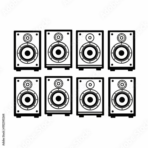 speaker, audio, sound, music, icon, vector, black-and-white, electronic, equipment, device, technology, entertainment, system, loudspeaker, woofer, tweeter, bass, treble, dj, party, concert, studio, high fidelity, stereo, graphic, design, illustration, digital, element, symbol, signs, abstract, modern, minimalist, flat, isolated, white background, row, array, group, collection, communication, broadcasting, production, quality, volume, acoustic