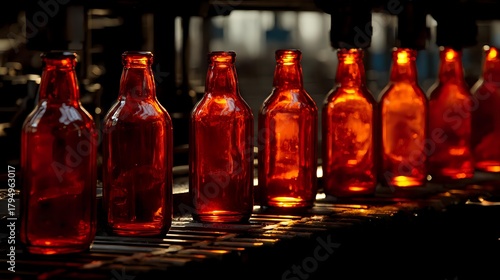 Row of empty amber glass bottles illuminated with warm red light on production line in brewery or beverage manufacturing facility.