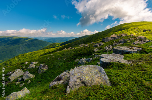 row of huge rocks on a grassy mountain. lovely summer scenery of Carpathian mountains. cloud approaching from behind the hill