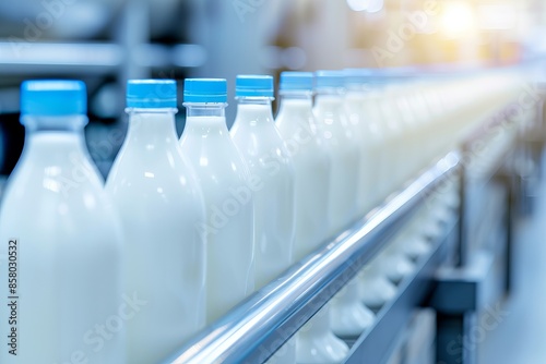 Row of milk bottles on a conveyor belt in a dairy production line, highlighting industrial process and food production efficiency.