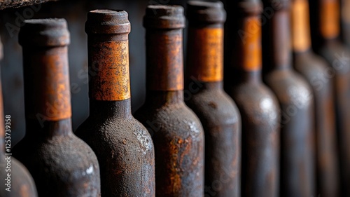 Row of old, rusty wine bottles in cellar