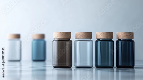 row, glasses, jar, cork, arranged, left, size, shape, largest, center, background, light, blue, colours, angle, visible, surface, diversity