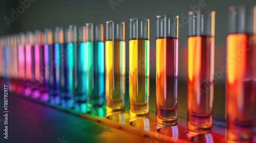 Row of test tubes with vibrant rainbow-colored liquids, arranged on a modern reflective surface, illustrating chemical analysis and pharmaceutical research.