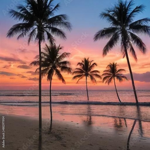 Row of tropical palm trees against sunset sky. Silhouette of tall palm trees. Tropical evening landscape. Gradient colorRow of tropic palm trees against sunset sky. Silhouette of palm tr