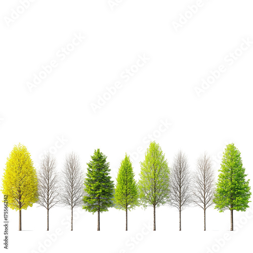 tree, foliage, forest, autumn, spring, summer, row, line, diverse, variety, green, yellow, grey, bare, leaf, branch, trunk, isolated, nature, timberland, timber, deciduous, evergreen, coniferous, plantation, grove, arboreal, environmental, ecological, seasonal, colourful, chromatic, black, background, cut-out, landscape, scenic, natural, botanical, park, garden, flora, plant, vegetation, growth, forestation, wood, racked