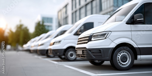 Row of white commercial parked in an urban setting with modern buildings and trees in the background during daylight