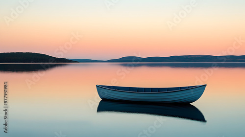 Rowboat gliding on a smooth lake with distant hills and a pastel-colored horizon