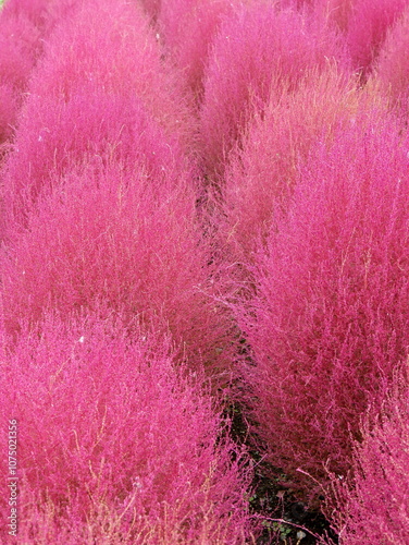 rows of bassia scoparia ragweed plants, with pink bright colors in fall season. Nature background with Fuchsia summer cypress or red kochia