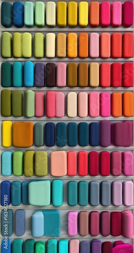 swatch, colours, fabric, textile, sample, design, material, selection, variety, spectrum, hue, tone, shades, rainbow, pattern, grid, organised, row, column, display, collection, modern, geometric, three-dimensional, texture, soft, cushion, furniture, interior, colourful, vibrant, pastel, deep, rich, bold, light, dark, home, decor, fabrication, commercial, retail, architectural, showcase, arrangement